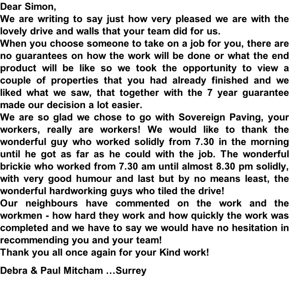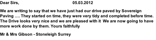 I have recently had my front drive block paved by Sovereign Paving and would like to thank Patrick, Simon & their team of hard working guys for the lovely job they have done. They worked very well as a team, and left the site tidy at the end of each day. Many people have passed by and commented on their work and I would have no hesitation in recommending them to others.