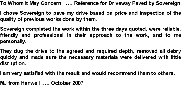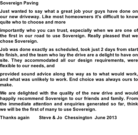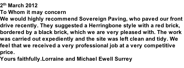 I have recently had my front drive block paved by Sovereign Paving and would like to thank Patrick, Simon & their team of hard working guys for the lovely job they have done. They worked very well as a team, and left the site tidy at the end of each day. Many people have passed by and commented on their work and I would have no hesitation in recommending them to others.